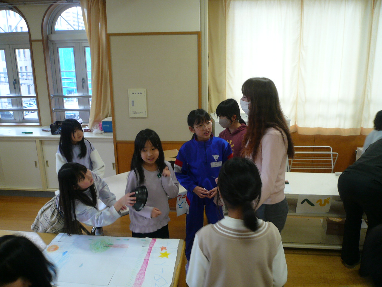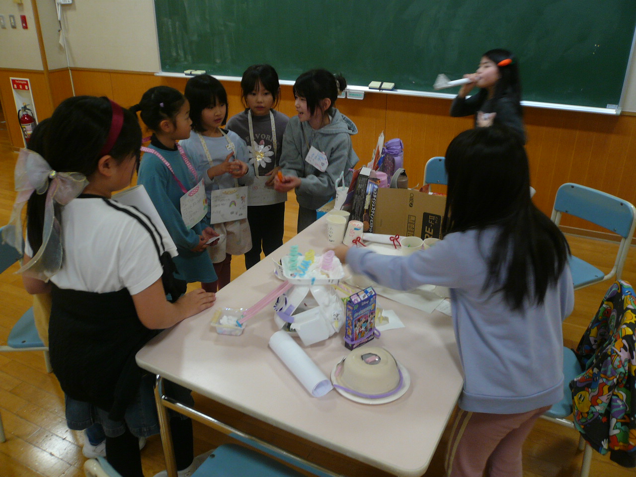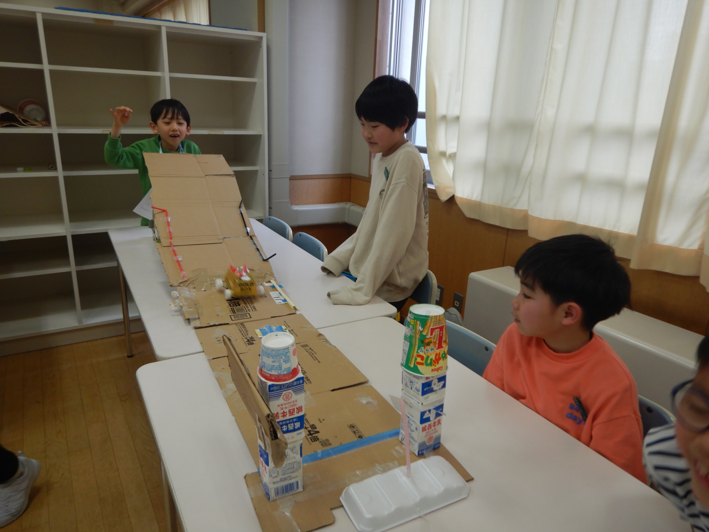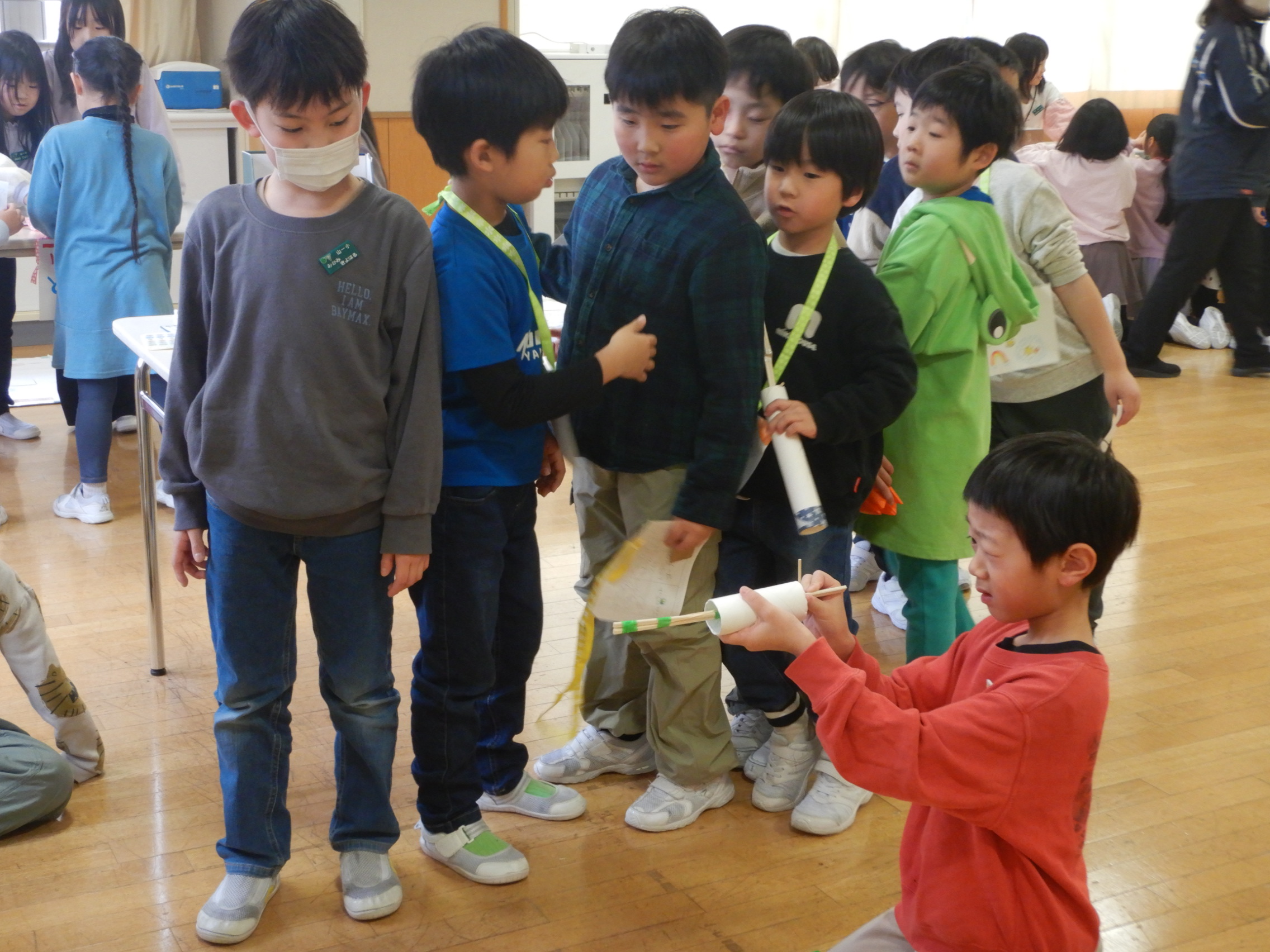 2年生が生活科で手作りおもちゃの遊び場「おもちゃランド」をつくりました。4時間目には、1年生を招待して楽しんでもらいました。休み時間には、上級生たちも参加して大賑わいです。2年生のみんなの満足そうな顔が心に残ります。