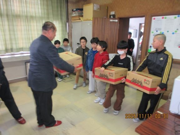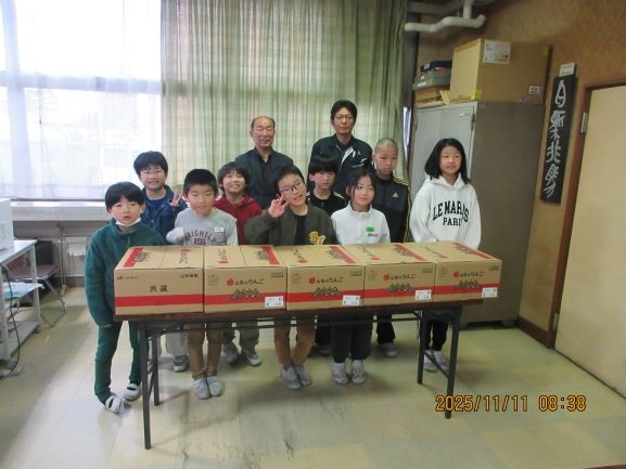 児童代表から「今年は猛暑でリンゴの栽培が難しかったと聞いています。こうしてたくさんいただくことができて本当にうれしいです」と感謝の言葉がありました。生産者を代表して丹野様からは「おいしいリンゴができたので、ぜひ味わって欲しい」「急に寒くなって、インフルエンザの心配がある時期なので、リンゴを食べて、健康管理をしっかりと」との励ましのお言葉もいただきました。本当にありがとうございます。