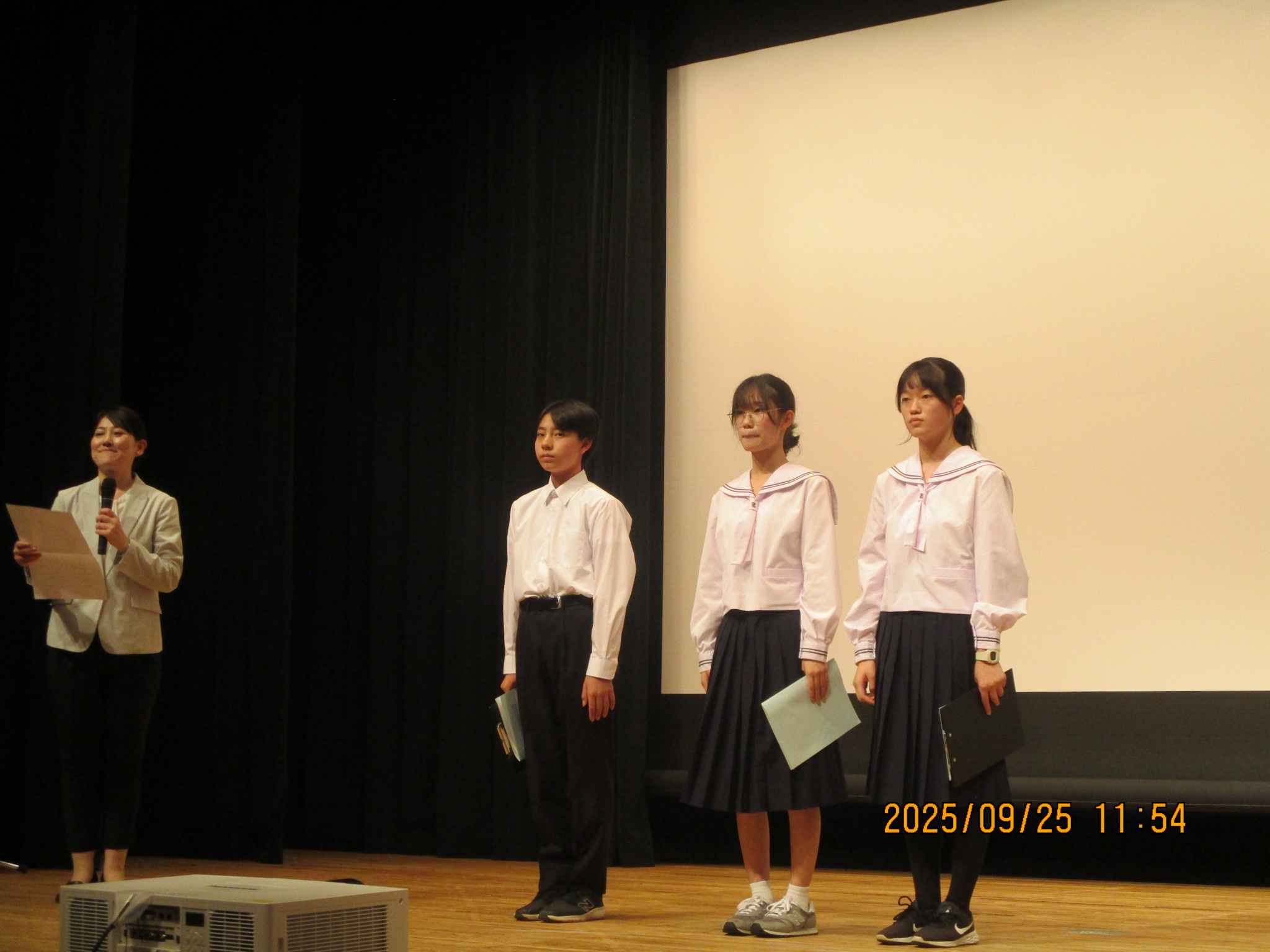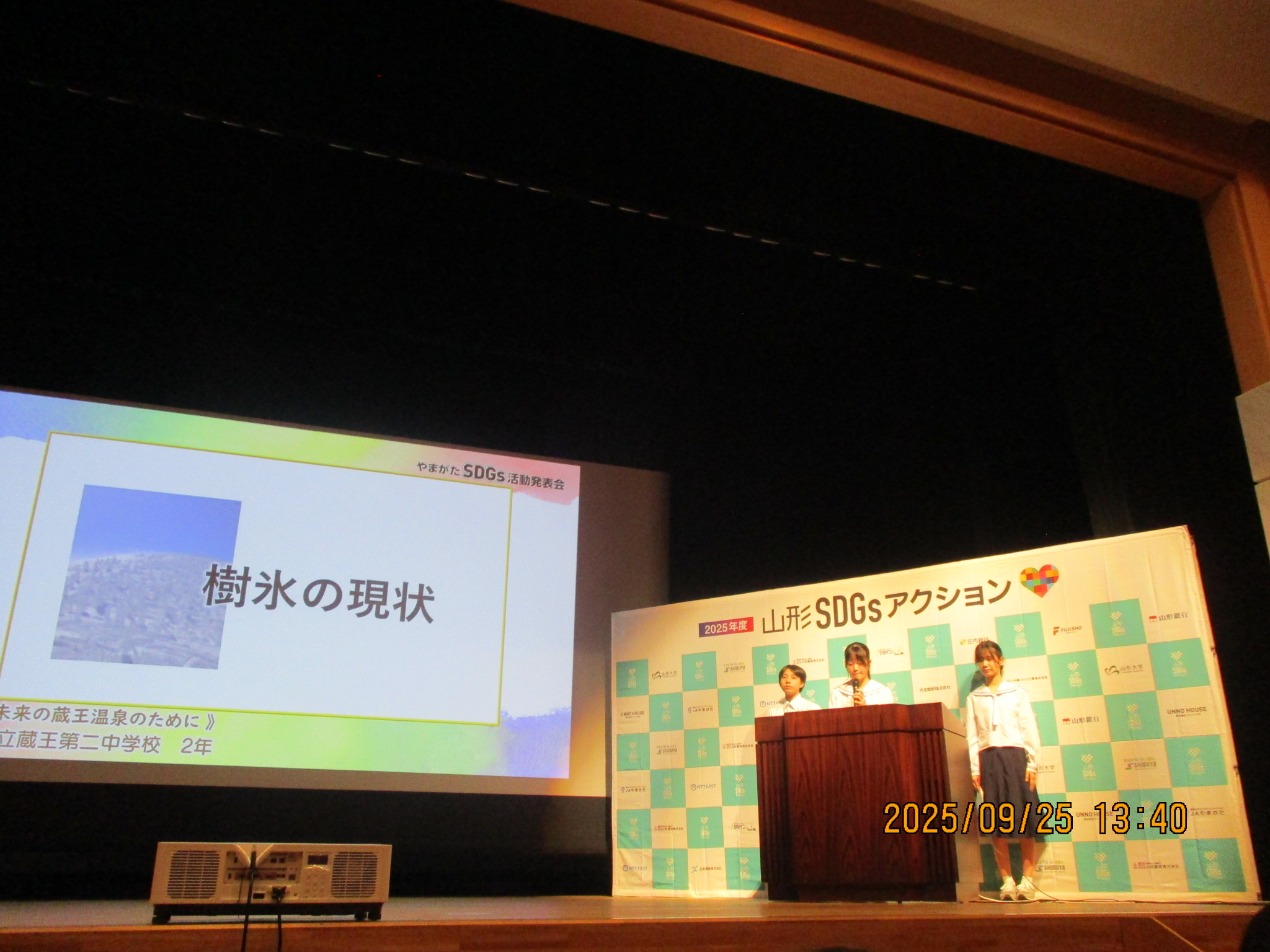 山形新聞社主催のやまがたSDGs活動発表会に中学生が参加しました。「今と未来の蔵王温泉のために」のテーマのもとで、地域清掃や樹氷復活にむけて取り組んできたことを、持続可能な社会づくりと関連付けながら発表しました。