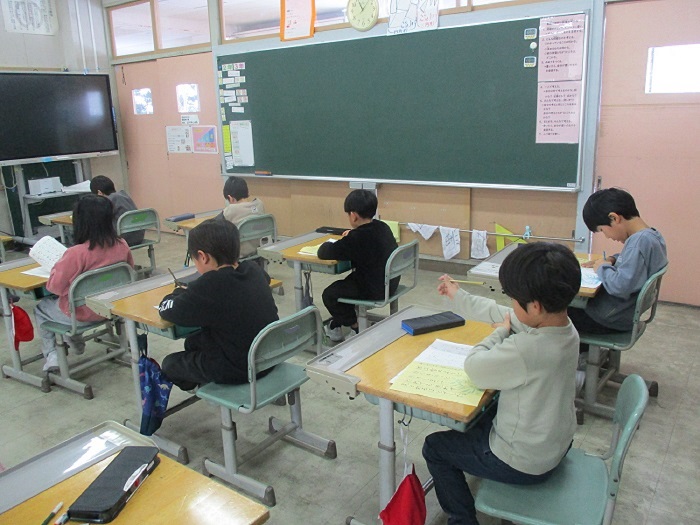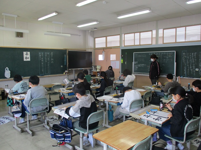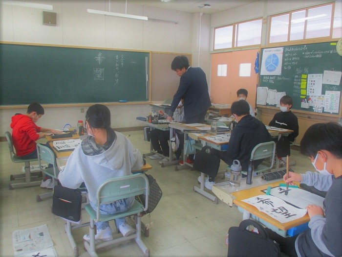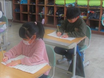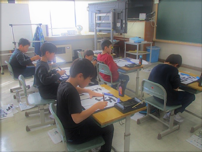 1月9日(金)3〜4校時、各教室で書き初めを行いました。子どもたちは、一筆一筆お手本と見比べながら、真剣に書いていました。