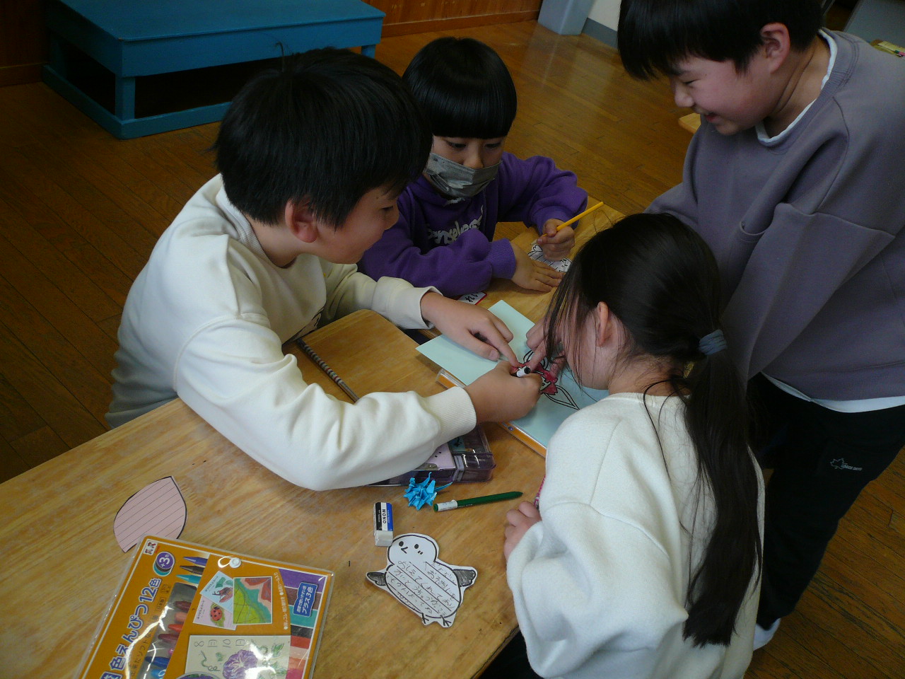 今日のベストフレンズデーは、1〜5年生で行われました。なぜなら、6年生を送る会でわたす、プレゼントづくりの時間だからです。みんな、6年生への思いを込めてメッセージを書いたり飾り付けたりしていました。5年生の実行委員がいろいろな係に分かれて提案し、準備が進められているのも頼もしく思います。