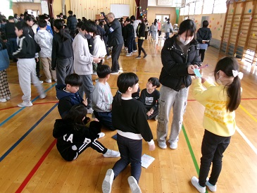 内容は、たてわり班で行う○×クイズ、6年生へのメッセージカードと歌のプレゼント、6年生からは、一人一人の名前を書いた栞とよびかけがありました。