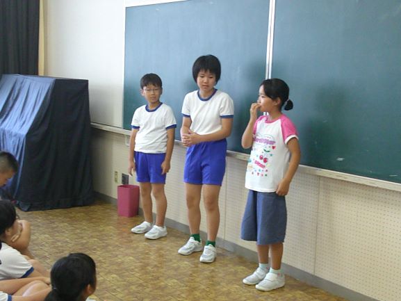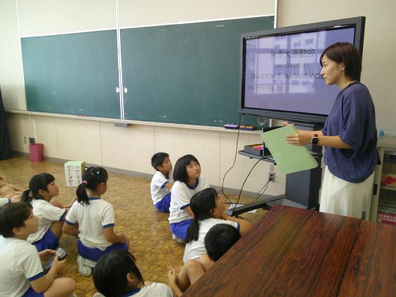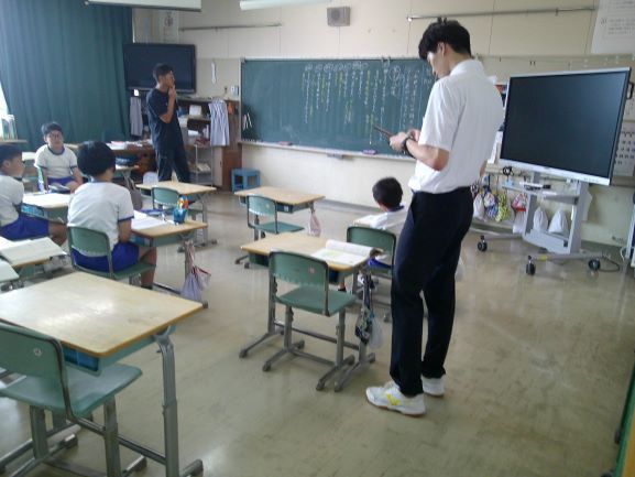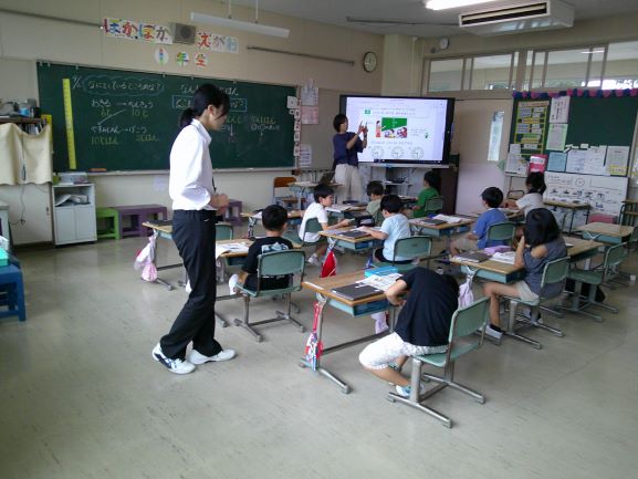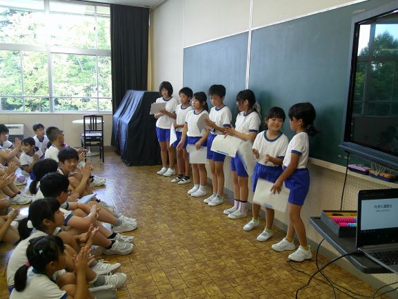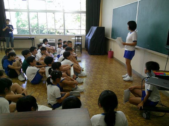 今日から3週間、教育実習生が2名来ています。1年生は、早速自分達で学校案内をしていました。カメラマンまでついていて本格的です。今日はまず授業を参観するところから始まりました。