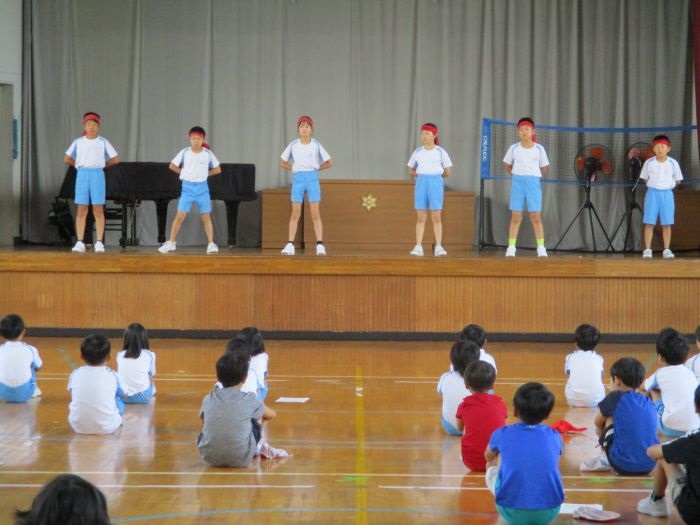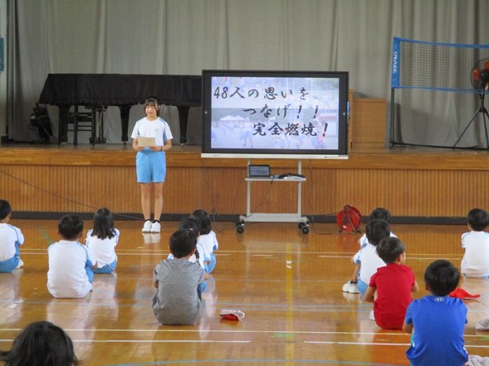 9月10日(水)の朝会では、集会委員の進行のもと、運動会集会が行われました。実行委員の紹介の後、運動会スローガンが発表され、続いて応援団が紹介されました。