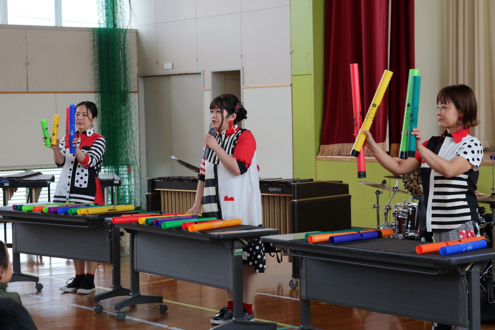 パーカッション(打楽器)だけでコンサートをするということなので子ども達も興味津々でしたが、知っている曲の演奏が始まると自然と手拍子がでたり、ドレミパイプを使った体験の時間があったりと寒い体育館でしたが、最後は心も体もほかほかになりました。