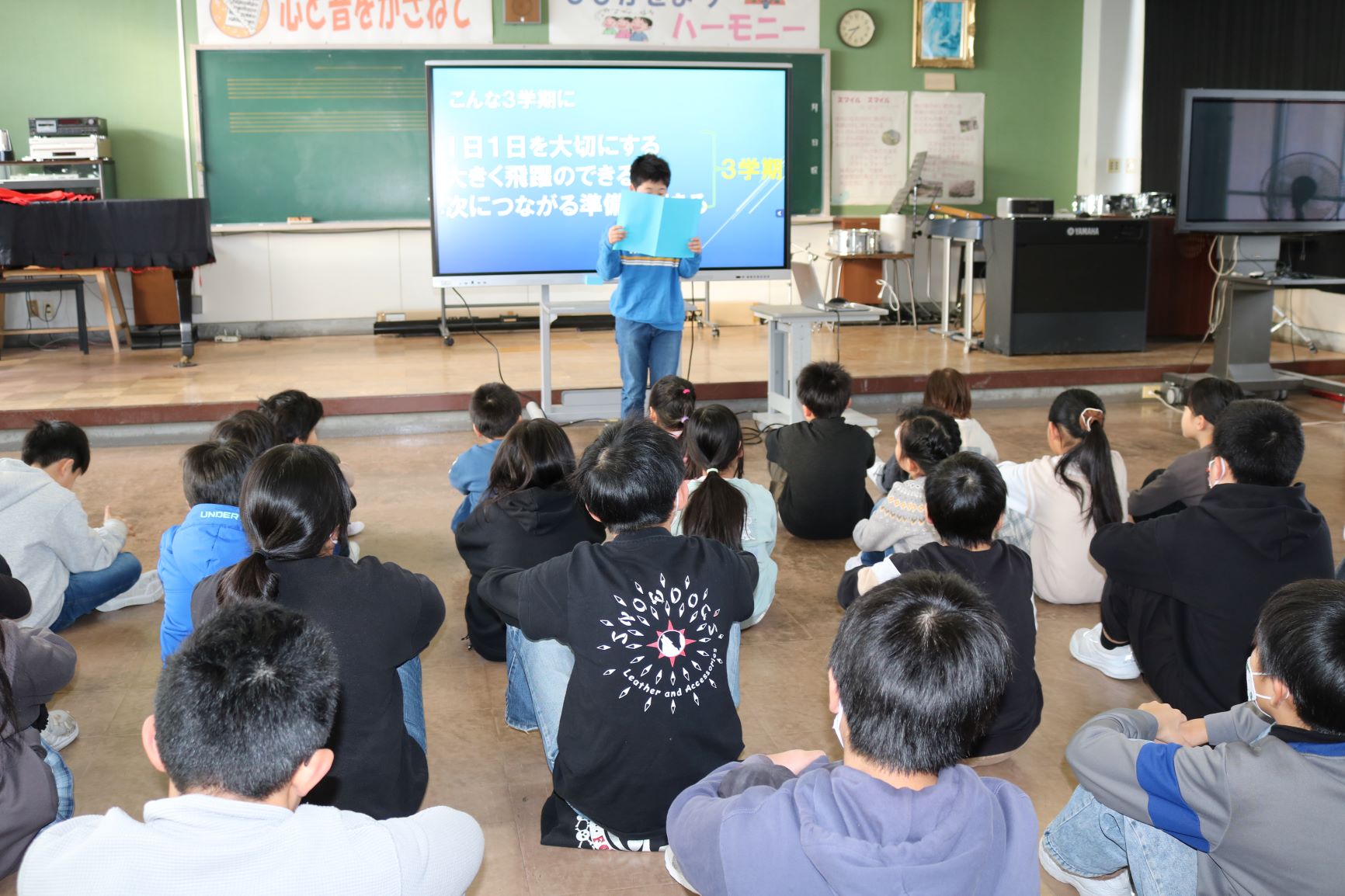 始業式では、校歌を歌い、児童代表の3学期にがんばることの発表と校長より「1日1日を大切にする」「大きく飛躍のできる」「次につながる準備のできる」3学期にという話をしたところです。